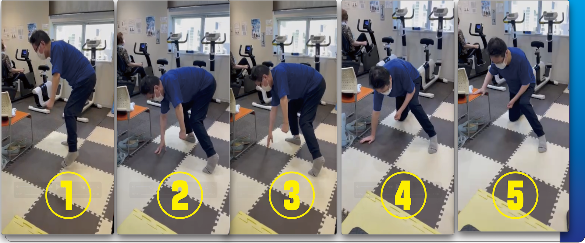 🔵椅子使いの、床ひざ座りからの、椅子掴みの立ち上がり。: